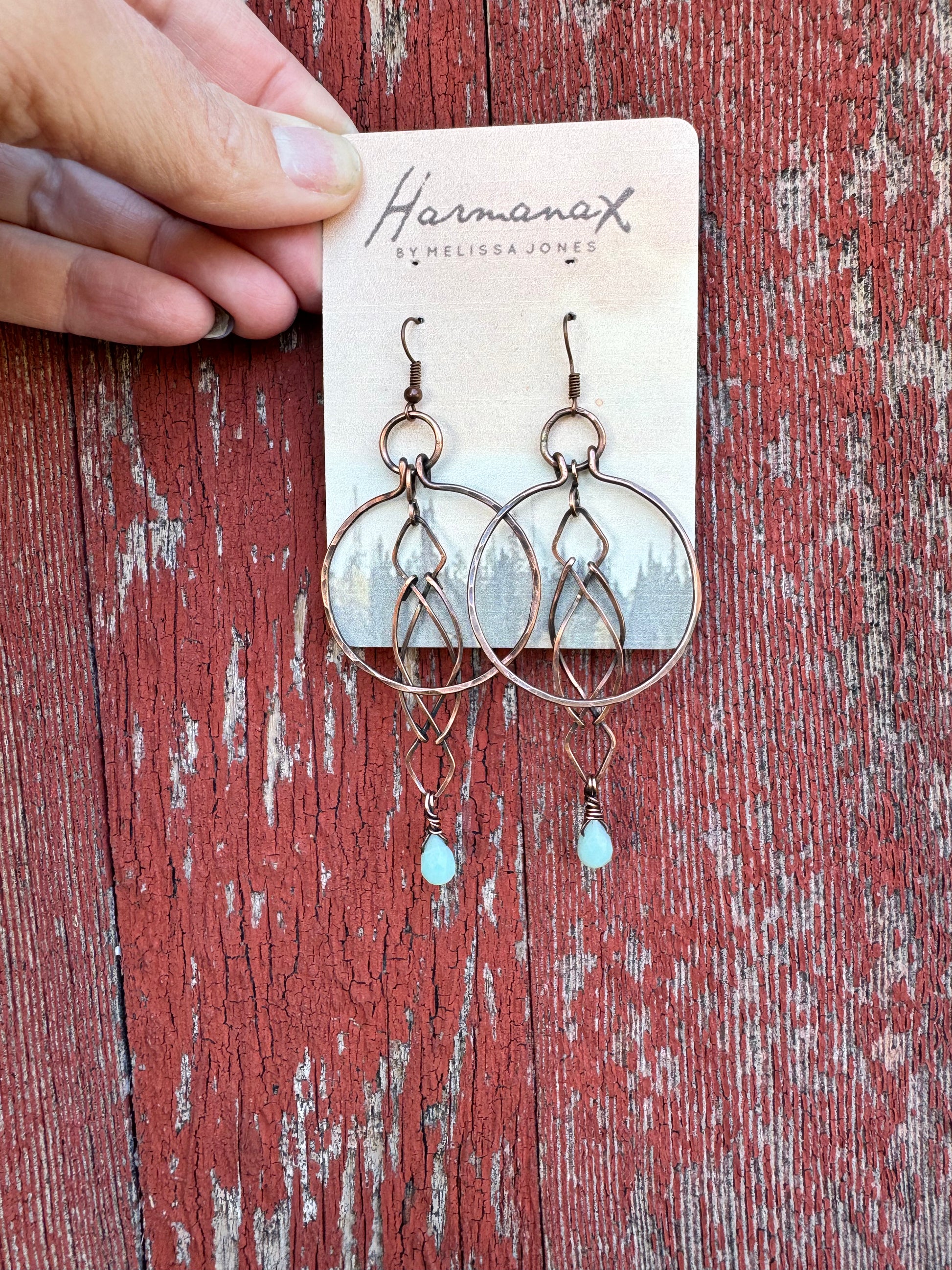 Every curve and twist is shaped and oxidized by hand — no two pairs are ever exactly alike. The soft aqua Amazonite teardrop adds a calming glow with each gentle movement.