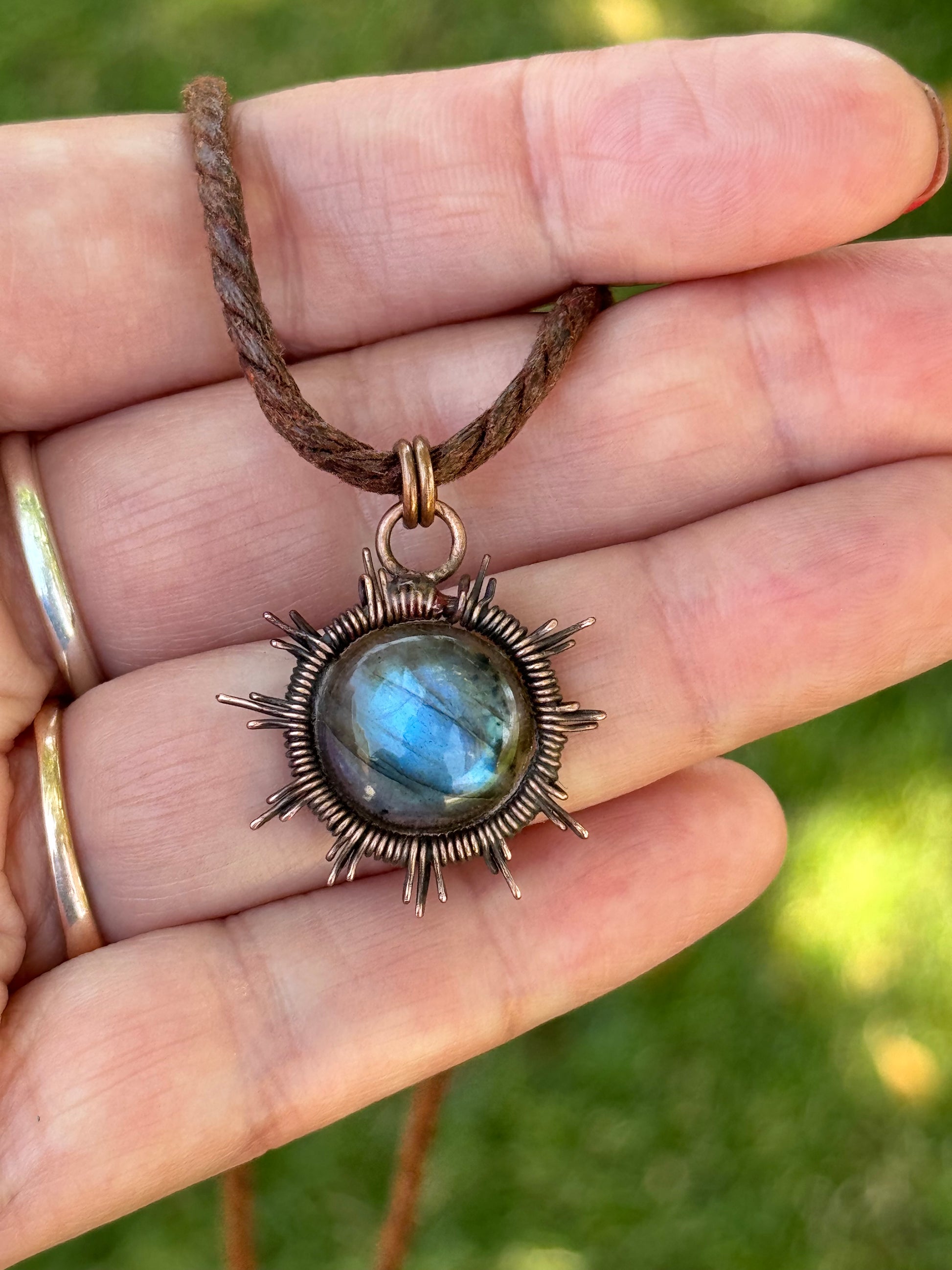 Labradorite stone with copper wire sunburst frame on cloth cord with copper lobster clasp