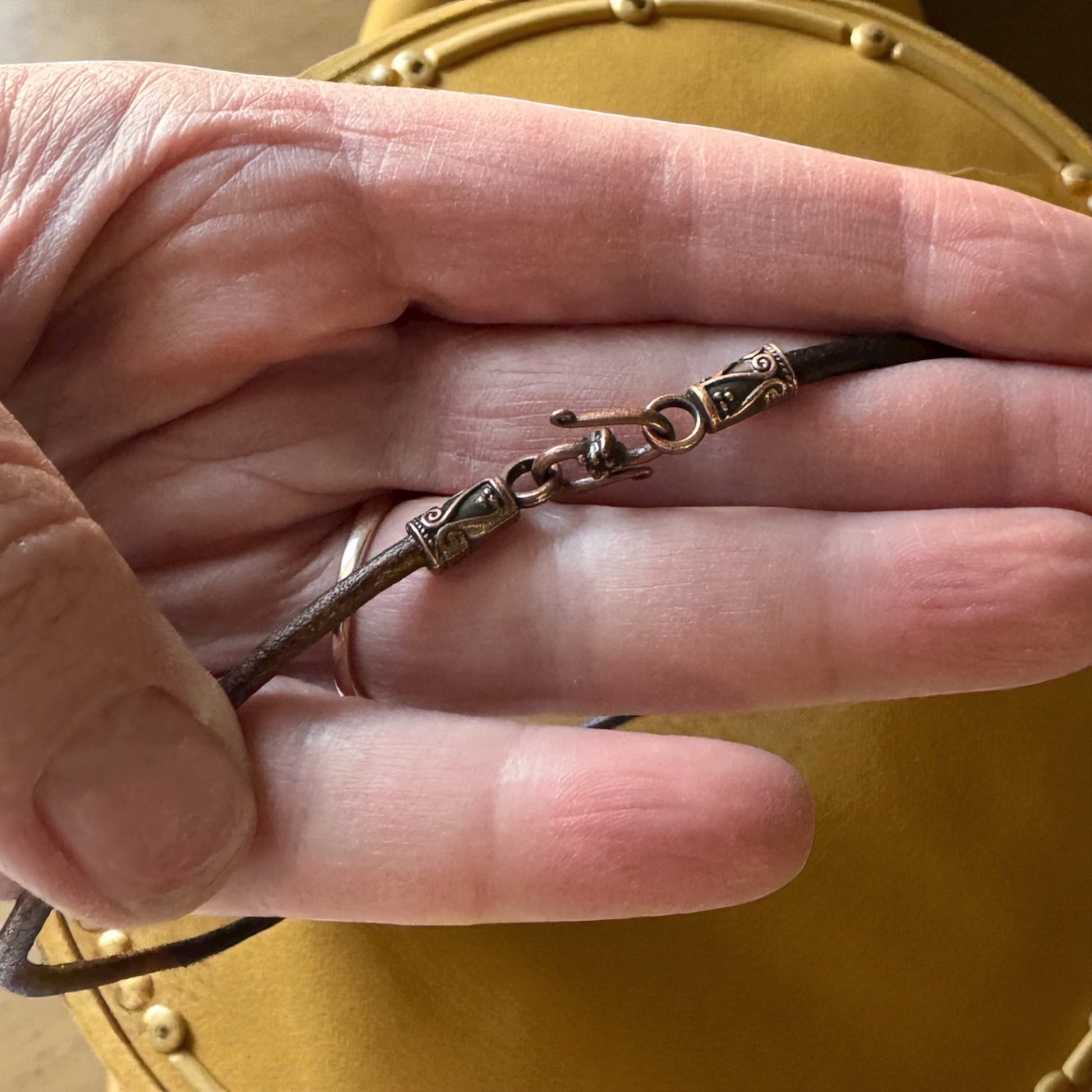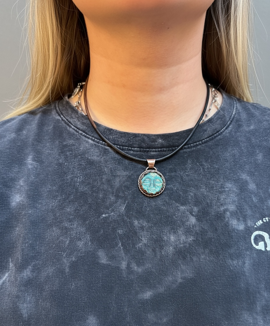 Embrace your inner moonchild with our Man in the Moon necklace. Featuring a stunning labradorite stone in a copper setting, this necklace is out of this world. The 3mm leather cord adds a touch of earthy charm to this quirky piece. Shine bright like the moon with this unique necklace!